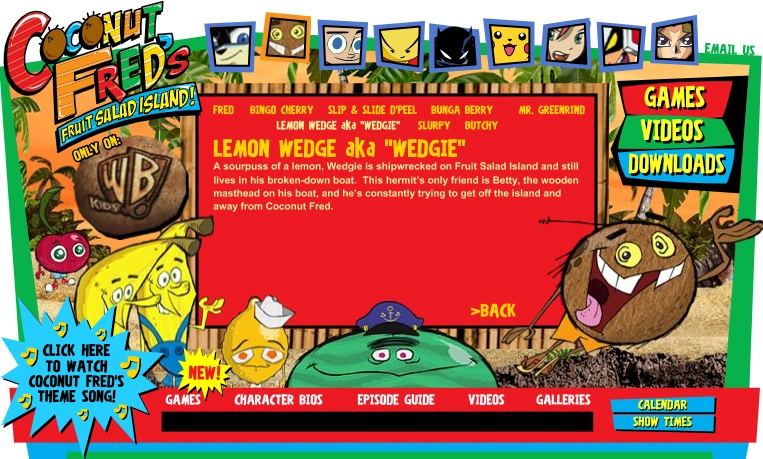 A sourpuss of a lemon, Wedgie is shipwrecked on Fruit Salad Island and still lives in his broken-down boat. This hermit’s only friend is Betty, the wooden masthead on his boat, and he’s constantly trying to get off the island and away from Coconut Fred.